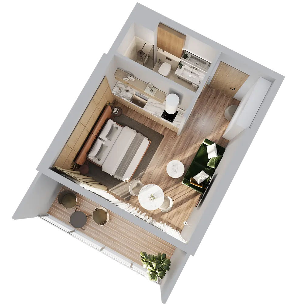 A city-view apartment at OKTO ART HOUSE offers a vibrant urban lifestyle combined with modern comfort. From your balcony, panoramic views of Batumi’s dynamic cityscape unfold, letting you enjoy the energy of the city while relaxing in a stylish and contemporary interior.