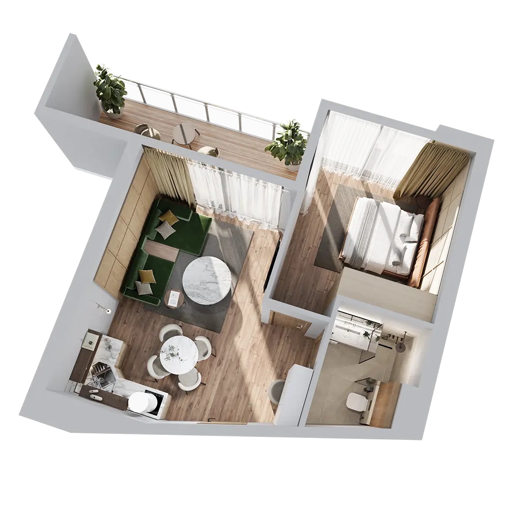 A mountain-view apartment at OKTO ART HOUSE offers peace, harmony, and close proximity to nature. From your balcony, uninterrupted mountain panoramas unfold, allowing you to start each morning with renewed energy and spend your evenings immersed in the calm and serenity of the surroundings.